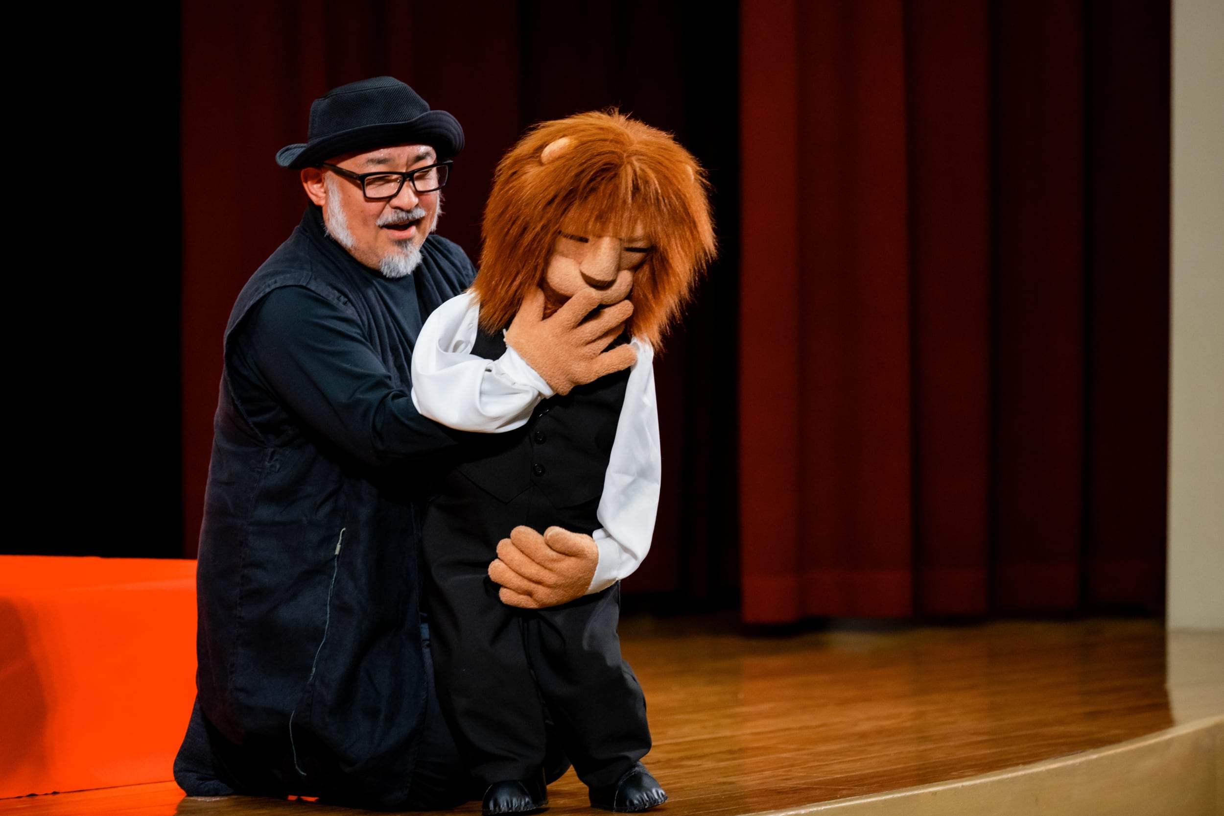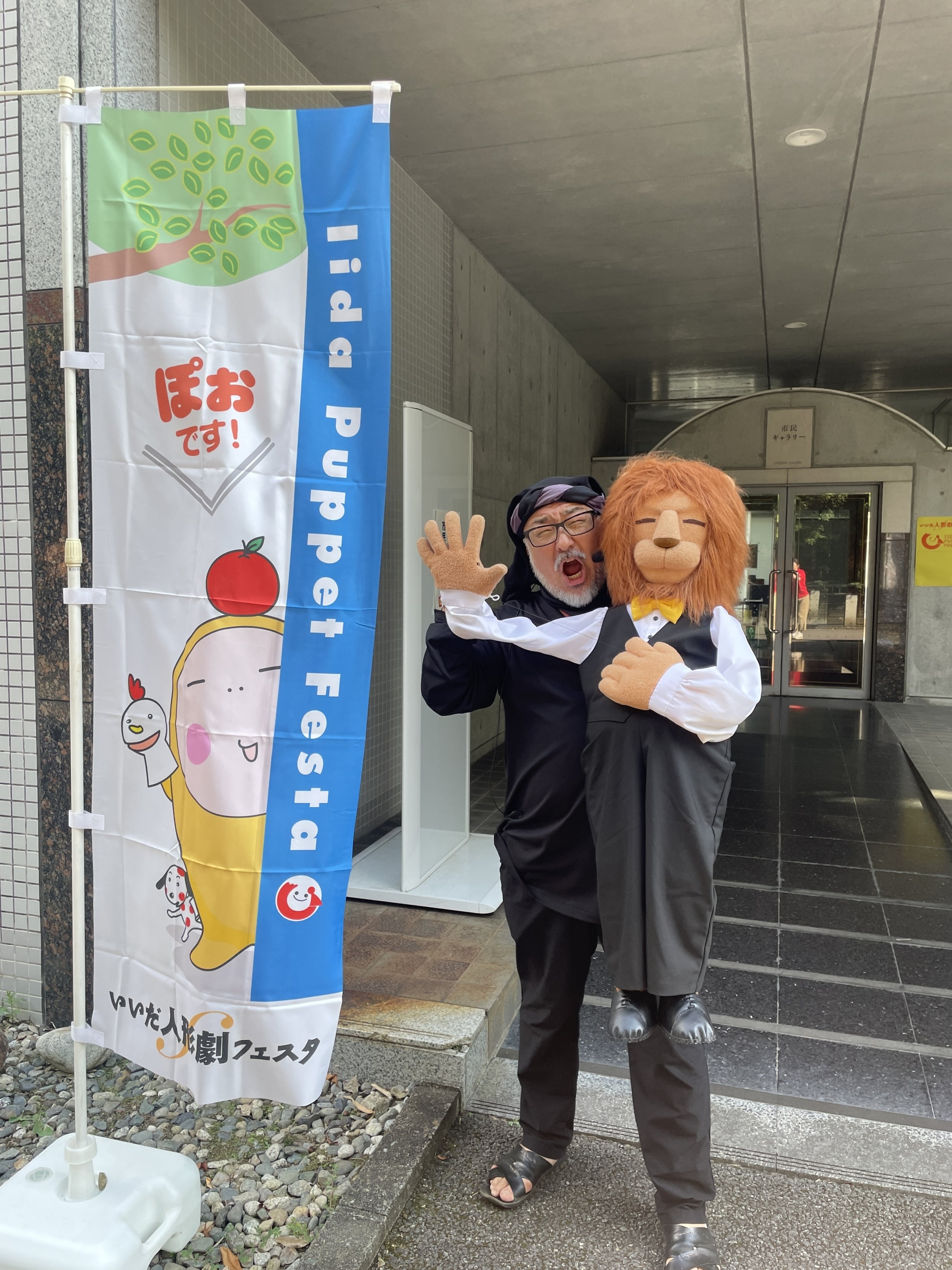 いいだ人形劇フェスタ、8/3丘の上結いスクエア、8/4飯田市美術博物館市民ギャラリー にて。パペットカウンセリングシアター「ライオン山本鉄男の人生語り」上演。